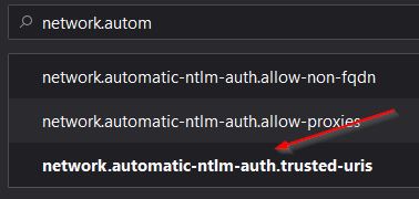 Next, in the search preference name bar at the top, start typing: network.autom and you will begin to see the entries below. The one we care about is the third one: network.automatic-ntlm-auth.trusted-uris.